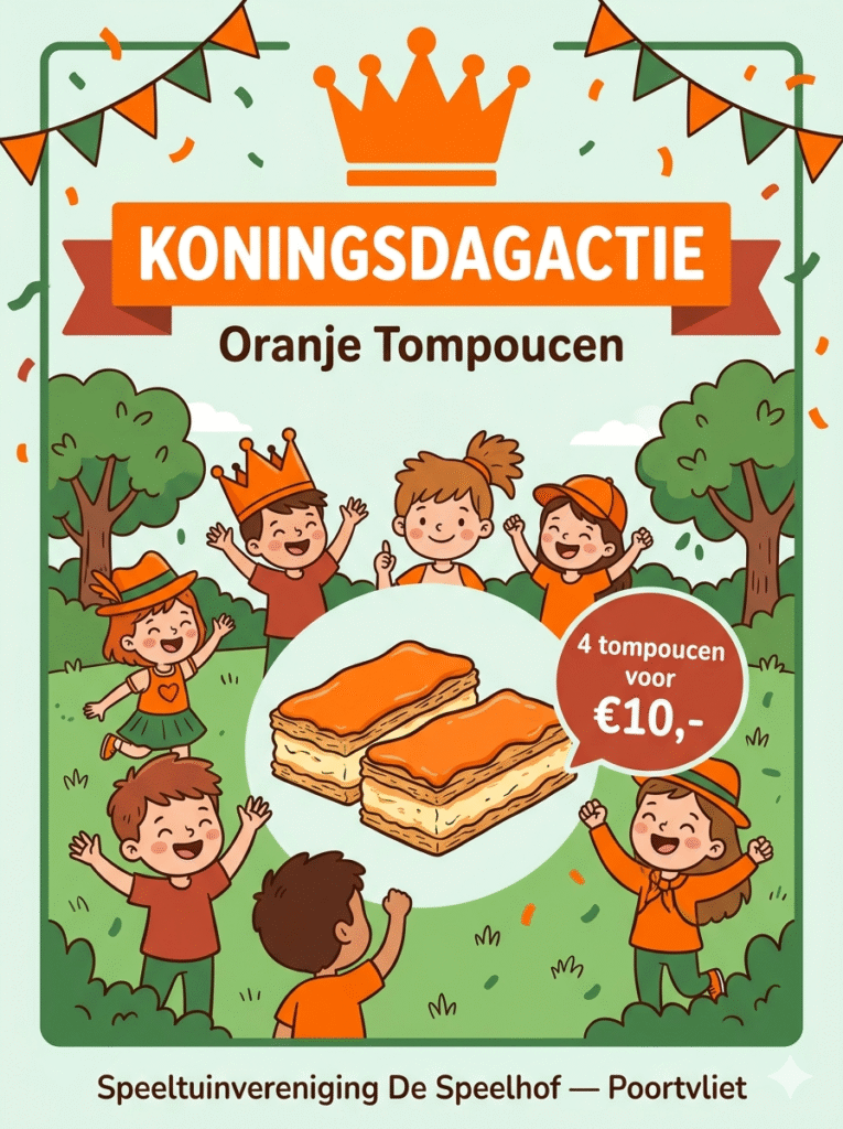 Voor de bouw van de nieuwe speeltuin organiseren wij samen met buurtsuper Attent een heerlijke Koningsdagactie! Bestel een doos met 4 oranje tompoucen voor slechts β¬10,- en steun daarmee de realisatie van een mooie, nieuwe speelplek voor alle kinderen.